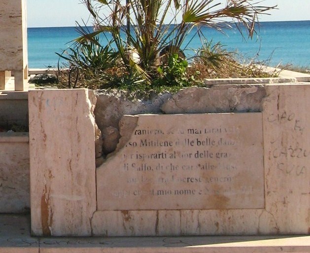 Sembra che siano scomparse le lastre in bronzo affisse sul piedistallo e non vedo traccia dei versi di Saffo...ma forse l'opera di restauro non è ancora finita, o almeno lo spero...