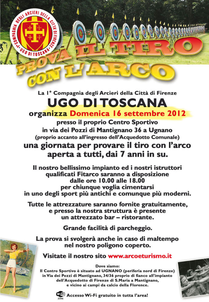 Domenica 19 settembre 2012, la 1^ Compagnia Arcieri della Città di Firenze “ Ugo di Toscana”, organizza presso il proprio Centro Sportivo in via Pozzi di Mantignano, 36 a Ugnano, una giornata per provare il tiro con l’arco aperta a tutti dai sette anni in su.