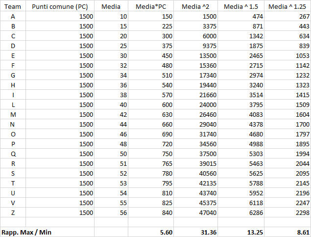 Comunque in questo modo si dovrebbe evitare che un team con 2001 comuni e media 10 passi avanti ad un team che ha 400 comuni con media 50 oppure 666 comuni con media 30 ....