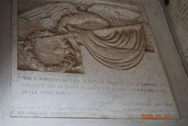 NON SI PIANGONO GLI EROI, SI IMITANO. SOLO SE NOI LI SAPREMO CULLARE CON UN CANTO DI AMORE E DI GLORIA DORMIRANNO IN PACE NELLE LORO TOMBE. GUERRA ITALO AUSTRIACA 1915/1918AUSPICE LA SEZIONE COMBATTENTI, IL COMUNE E IL...(CANCELLATO)DI PESCAROLO, QUI' VOLLERO NELL'ANNO XVI ONORARE I PROPRI CADUTI.