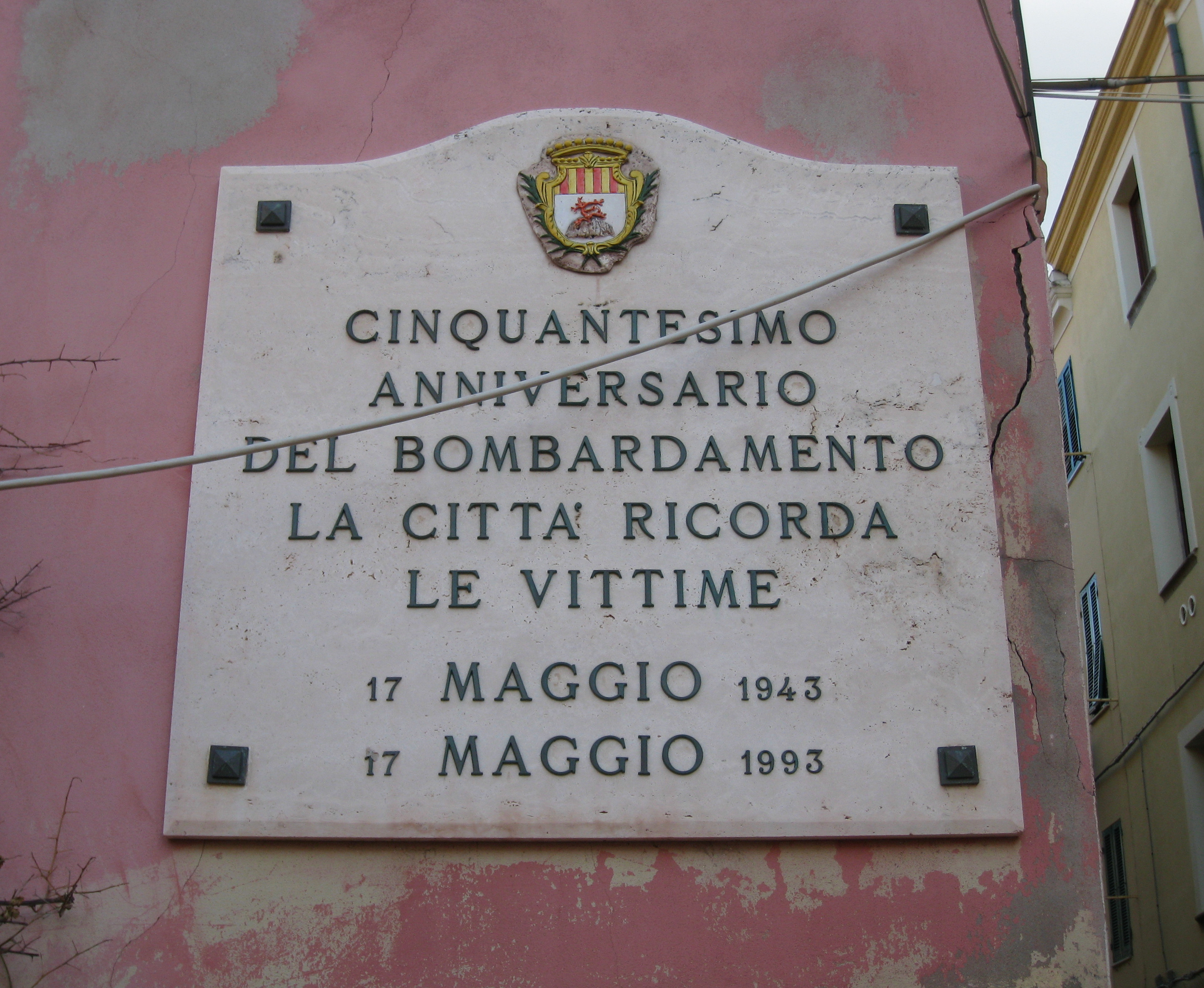 File:Alghero - LAPIDE CINQUANTESIMO ANNIVERSARIO BOMBARDAMENTO CITTA' - Via Gilbert Ferret.jpg