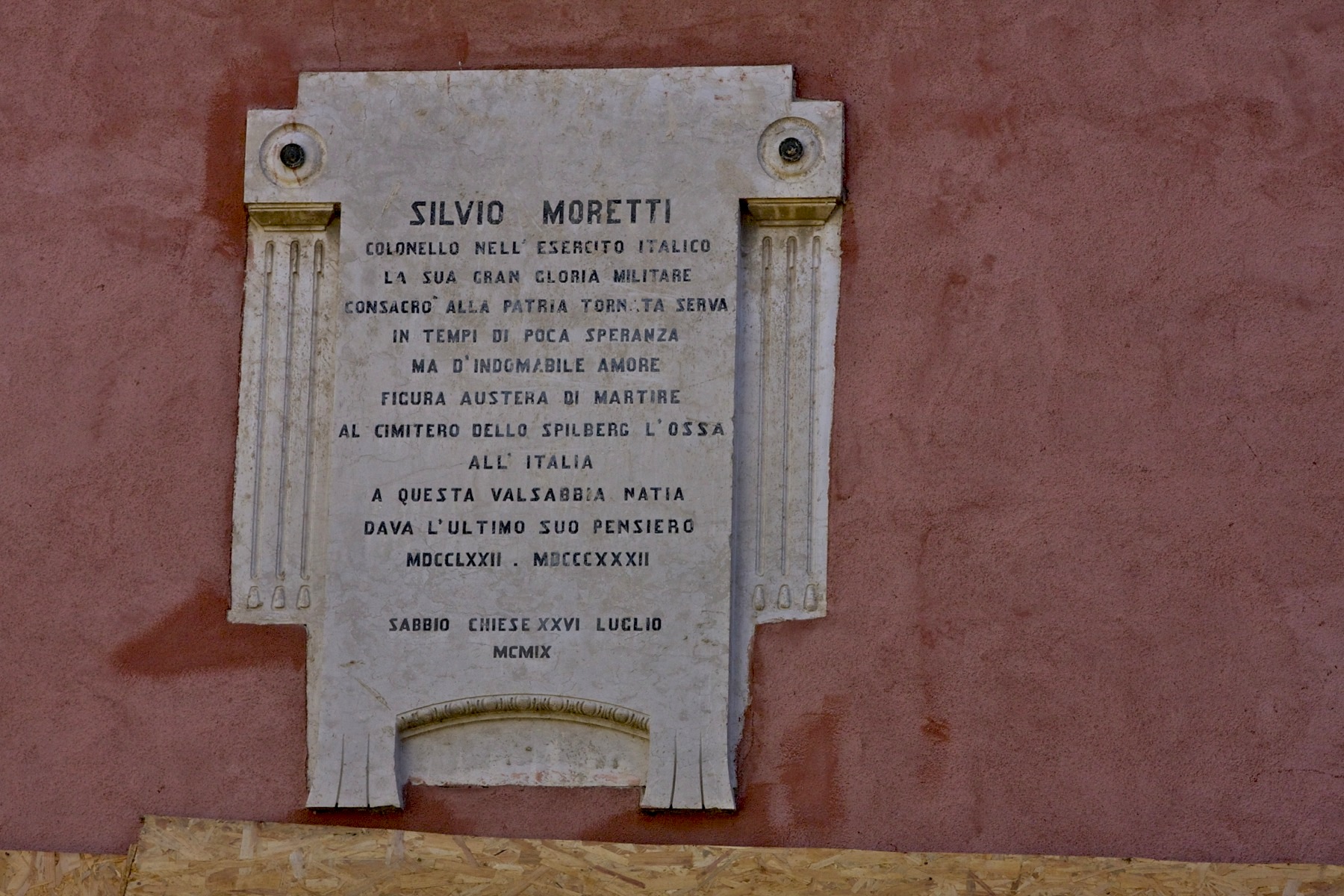 19:15, 2 dic 2012Sabbio Chiese - Lapide a Silvio Moretti - su casa privata.jpg (file)633 KBMacmamauri{{CopyrightAutore|Macmamauri}} Categoria:Lapidario Sabbio ChieseCategoria:Lapidario Lombardia La lapide recita: SILVIO MORETTI / COLONELLO NELL'ESERCITO ITALICO / LA SUA GRAN GLORIA MILITARE / CONSACRÒ ALLA PATRIA TORNATA SERVA / IN TEMPI DI PO1